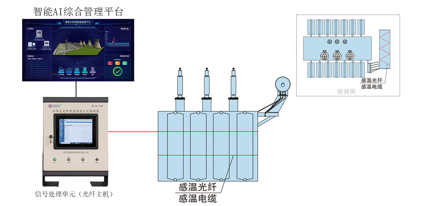 微探科技變壓器溫度監(jiān)測(cè)系統(tǒng)主要監(jiān)測(cè)對(duì)象為變壓器繞組及鐵芯,由于繞組存在于變壓器內(nèi)部中間地帶,傳感器直接接觸式測(cè)量繞組及鐵芯,那么傳感器后期的維保工作將十分困難,所以本方案采用間接監(jiān)測(cè)法,通過(guò)間接測(cè)量變壓器外殼溫度,從而判斷核心繞組及鐵芯的溫度。對(duì)于外部間接測(cè)溫方式是通過(guò)在其表面按標(biāo)準(zhǔn)敷設(shè)感溫光纖測(cè)溫產(chǎn)品,由于感溫光纖緊貼附于外殼表面,所以測(cè)溫?cái)?shù)據(jù)更加接近內(nèi)部溫度數(shù)據(jù)。測(cè)溫主機(jī)可通過(guò)RS485通訊方式,將數(shù)據(jù)上傳到智能AI綜合管理平臺(tái),當(dāng)變壓器溫度出現(xiàn)異常時(shí),系統(tǒng)可進(jìn)行實(shí)時(shí)告警,保障變壓器運(yùn)行穩(wěn)定。
